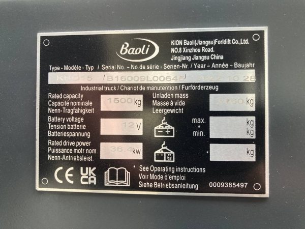 Új targonca, 2,4 üzemórával! 1.5 t teherbírású Baoli KBD 15+ típusú dízel targonca eladó. Felszereltség: 4 hengeres Doosan dízel motor, utánégető rendszer, hagyományos hidrodinamikus (wandler) meghajtás, 3.3 méterre emelő duplex (kéttagú) oszlop, Cascade villa oldalmozgató, tömör gumik, munkalámpa, hátrameneti hangjelzés, tető, CE bizonylat, kezelési utasítás. Gyártási dátum: 2022.10.28., Gyári szám: B16009L00645.