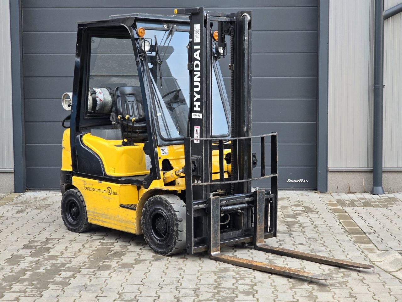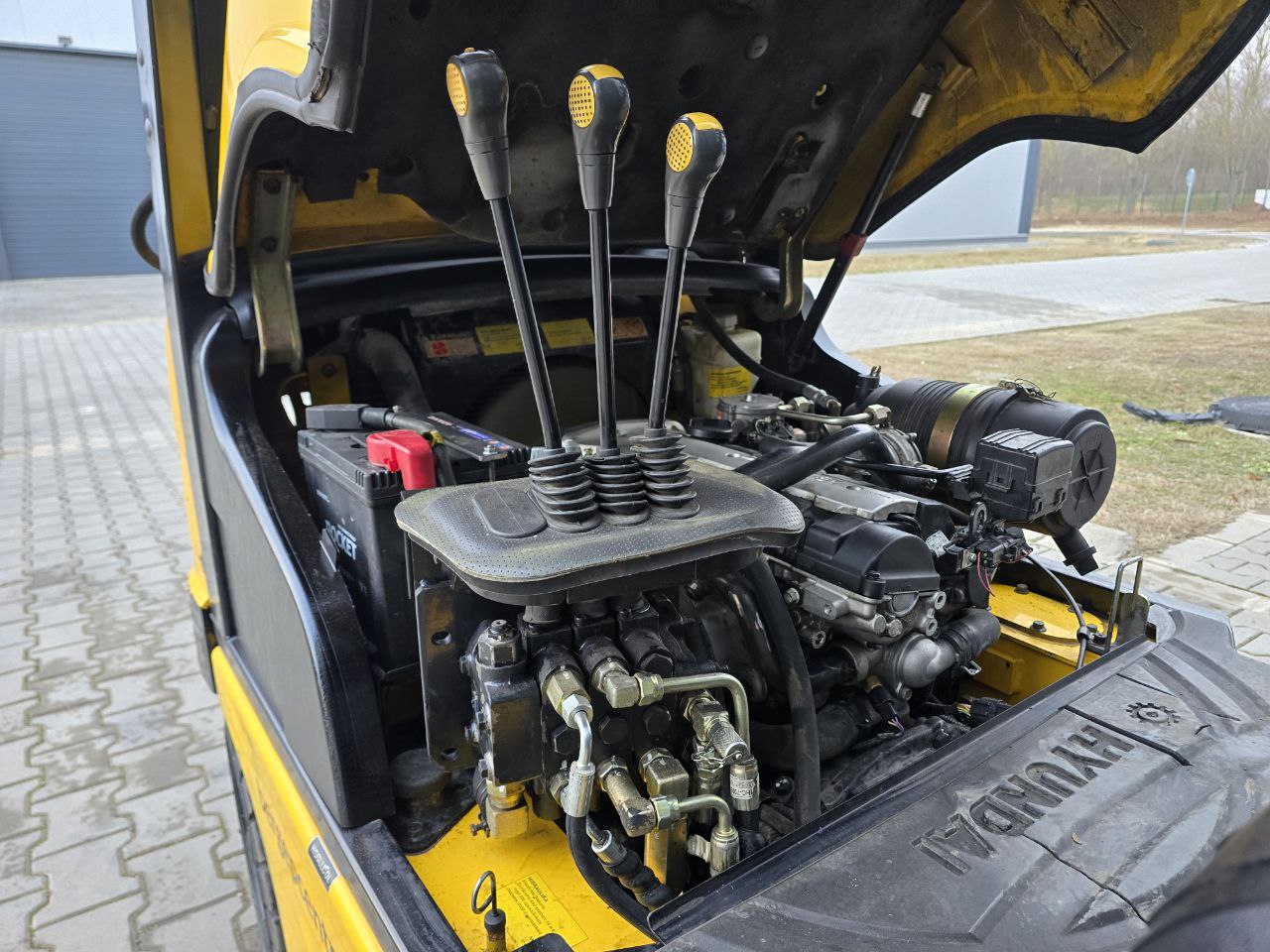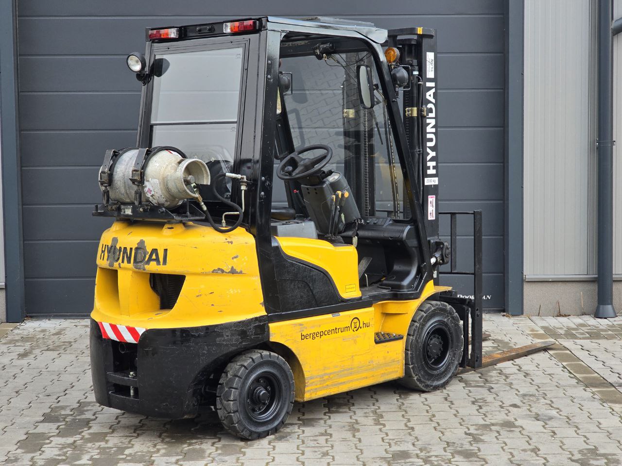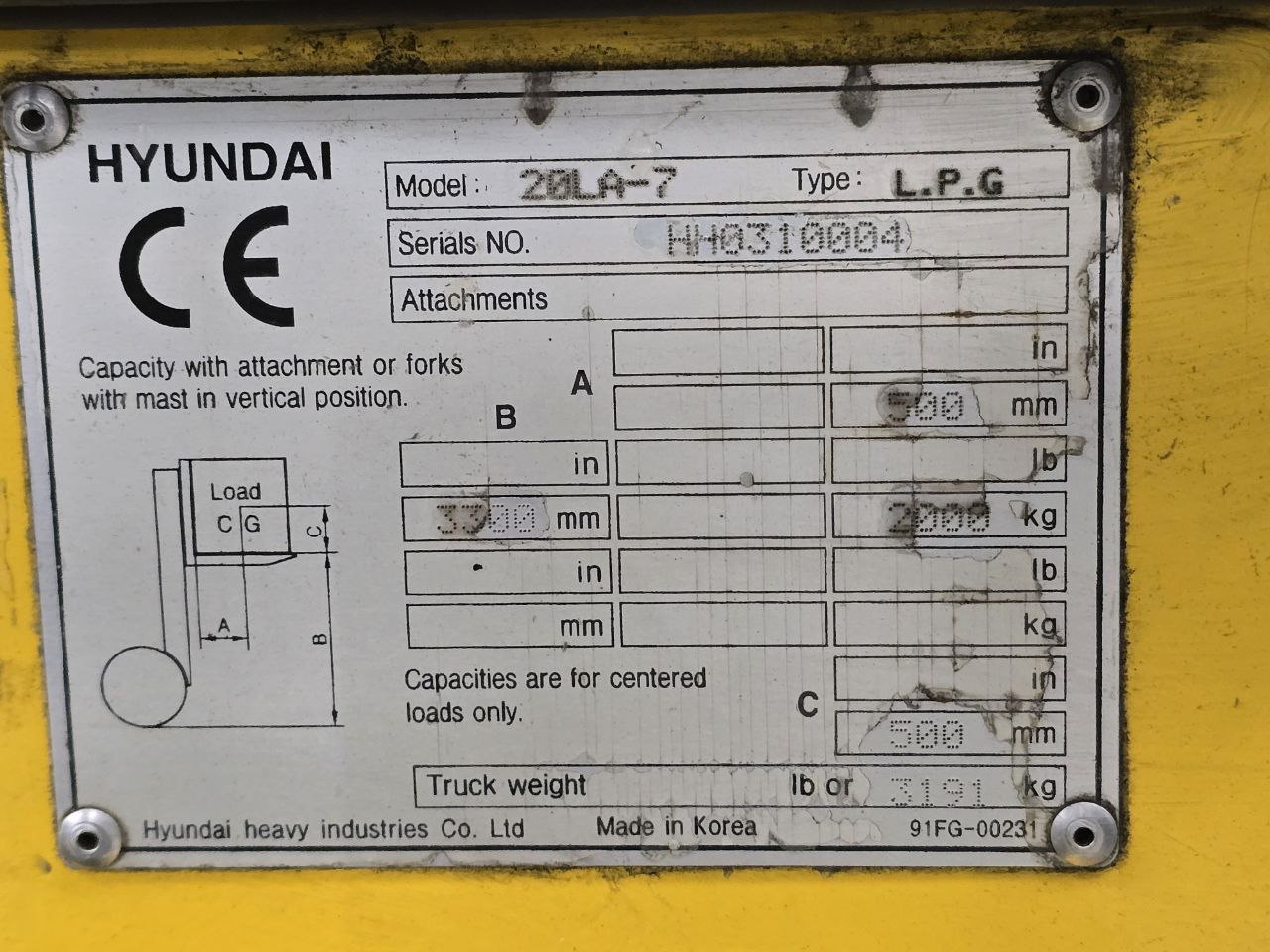 2 t teherbírású, 3.3 méterre emelő, gázüzemű HYUNDAI 20LA-7 típusú targonca eladó. Felszereltség: 4 hengeres HYUNDAI gázüzemű motor, hagyományos hidrodinamikus (wandler) meghajtás, 3.3 méterre emelő duplex (kéttagú) oszlop, villa oldalmozgató,3 szekciós hidraulika vezérlőtömb, tömör gumik, munkalámpa, hátrameneti hangjelzés, első-hátsó szélvédő, tető,