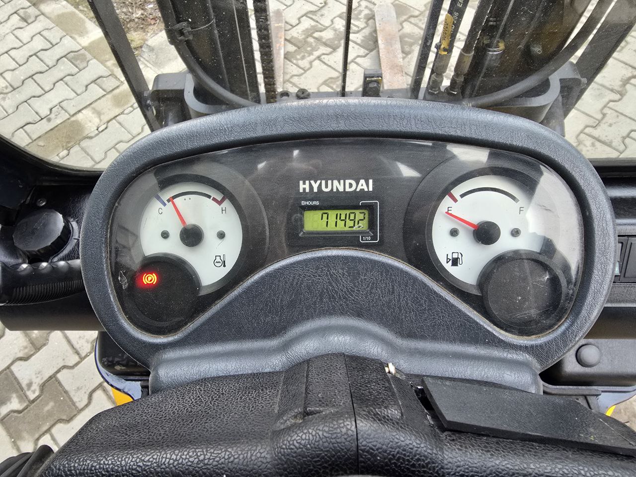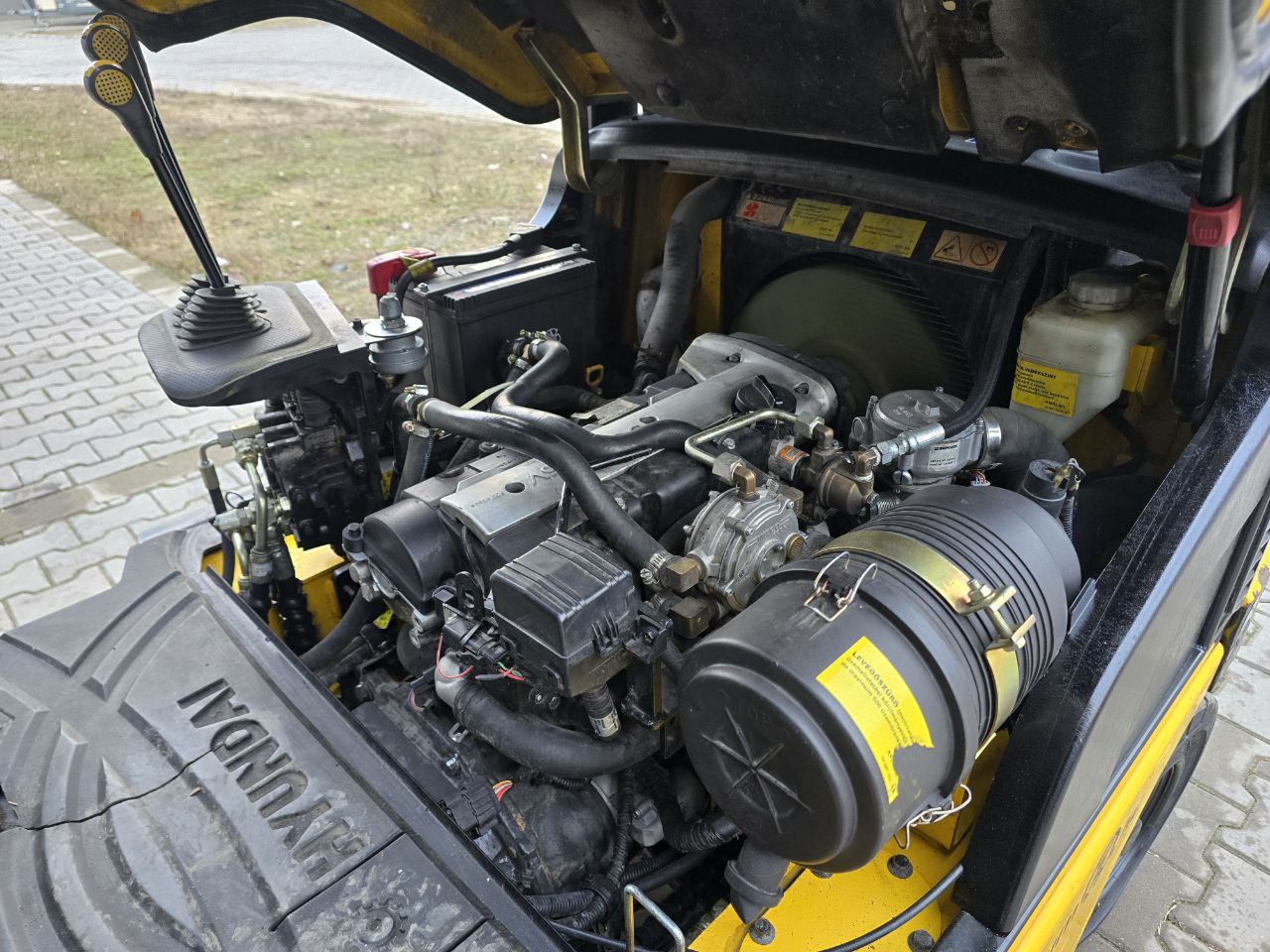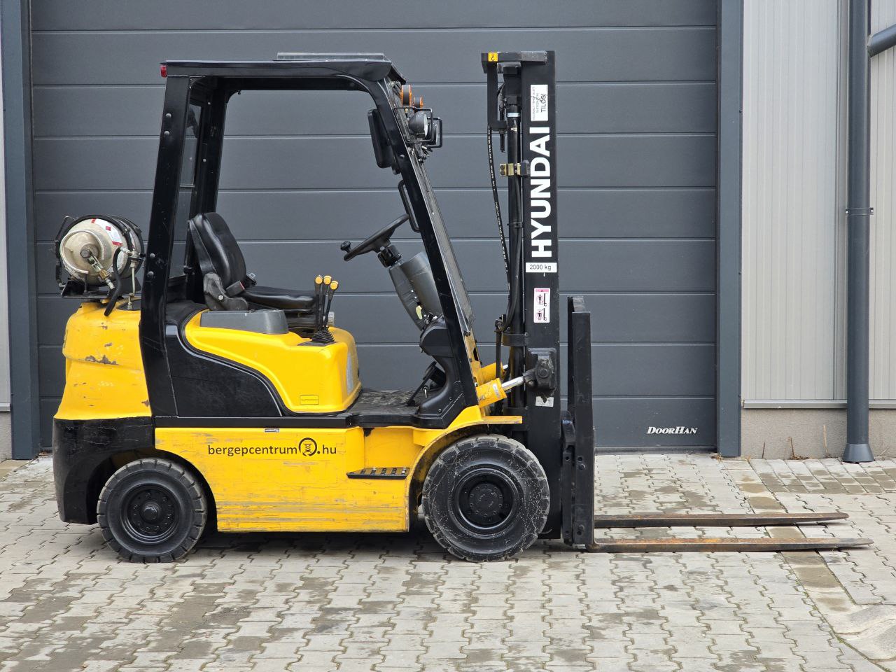2 t teherbírású, 3.3 méterre emelő, gázüzemű HYUNDAI 20LA-7 típusú targonca eladó. Felszereltség: 4 hengeres HYUNDAI gázüzemű motor, hagyományos hidrodinamikus (wandler) meghajtás, 3.3 méterre emelő duplex (kéttagú) oszlop, villa oldalmozgató,3 szekciós hidraulika vezérlőtömb, tömör gumik, munkalámpa, hátrameneti hangjelzés, első-hátsó szélvédő, tető,